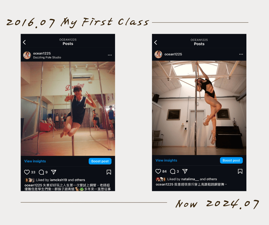 我想應該不是因為我很喜歡運動,畢竟我在這之前沒有任何運動習慣;可能也不是因為我想穿得很少,畢竟我對自己的體態並不是這麼有自信。就算我喜歡運動或穿很少,照理說我也有其他選擇,我可以去海邊玩水拍美照,而不是走上這條充滿挫折、瘀青、疼痛的鋼管之路。
